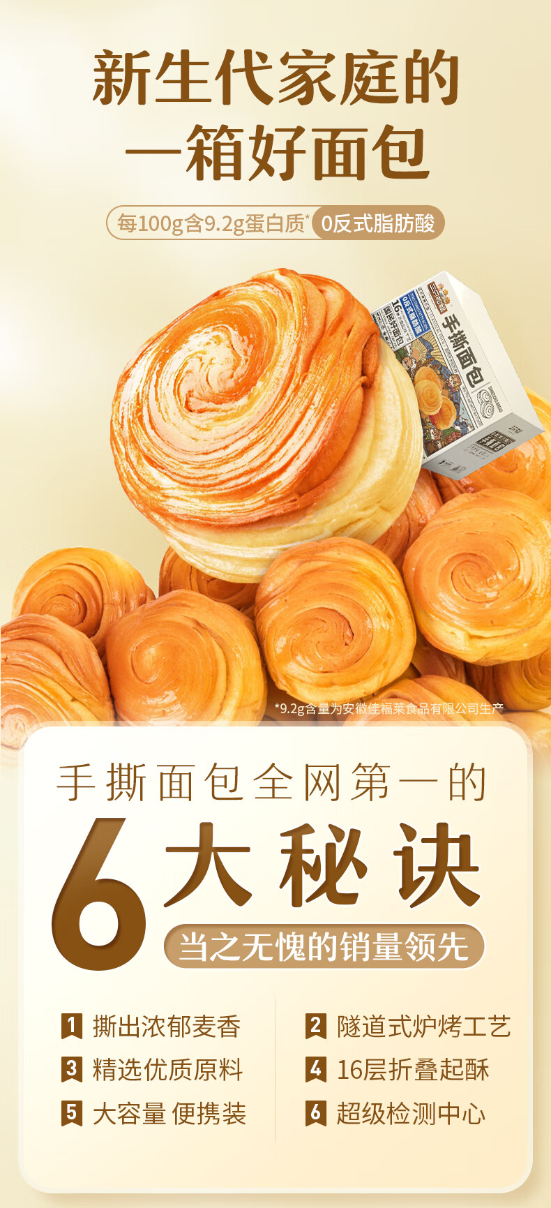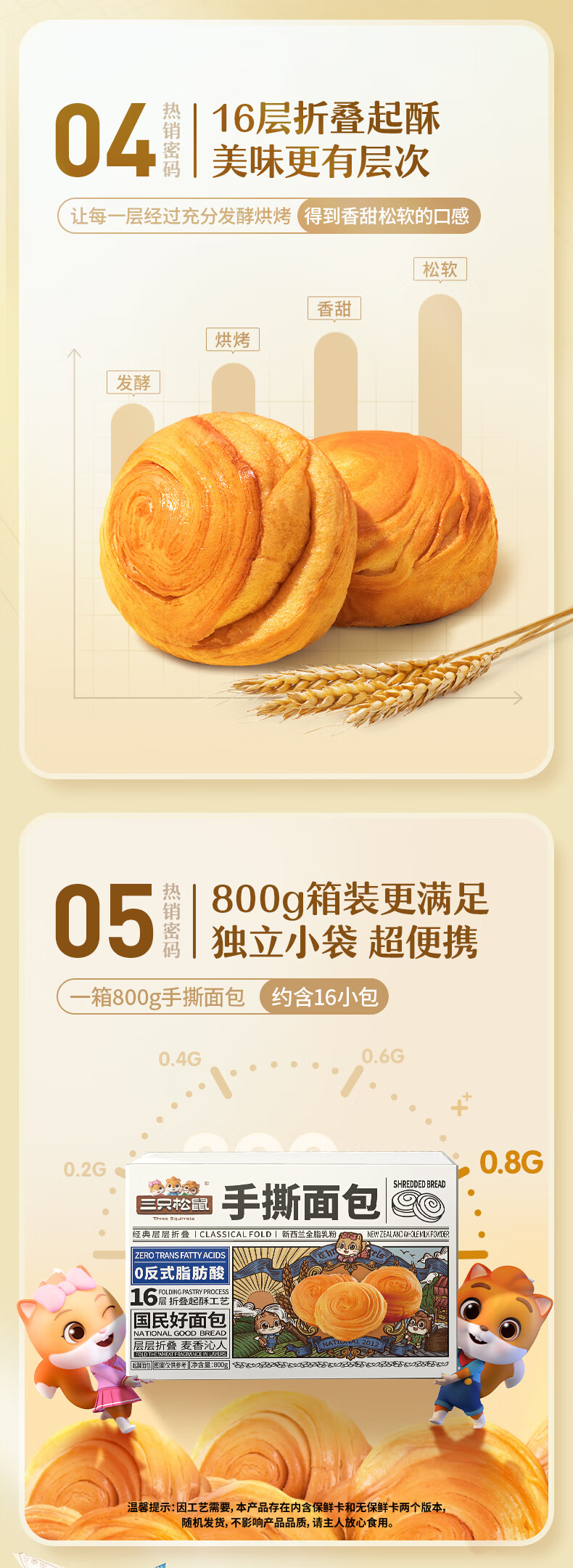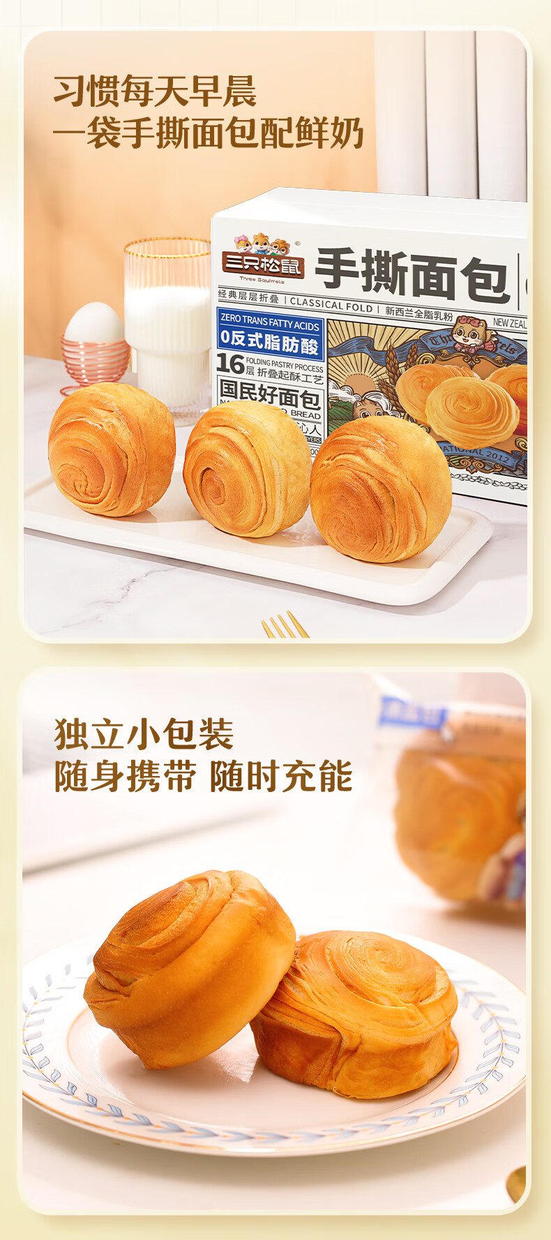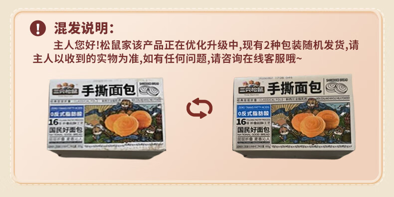 三只松鼠手撕面包 早餐面包代餐休闲零食酵母小面包量贩装约16包800g/箱