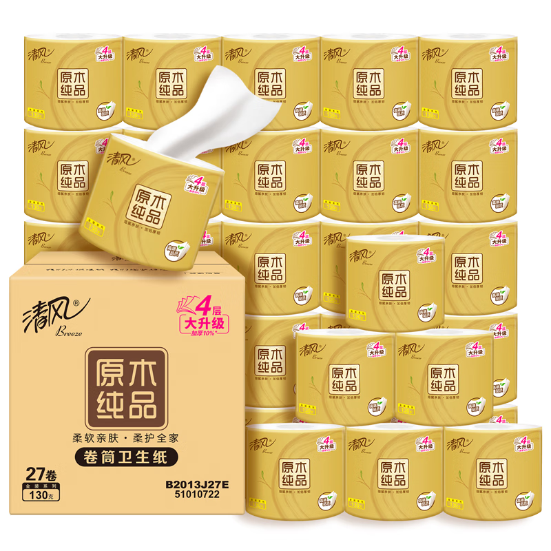 清风有芯卷纸 原木金装4层130克*27卷 卫生纸 纸巾整箱 厕纸 卷筒纸